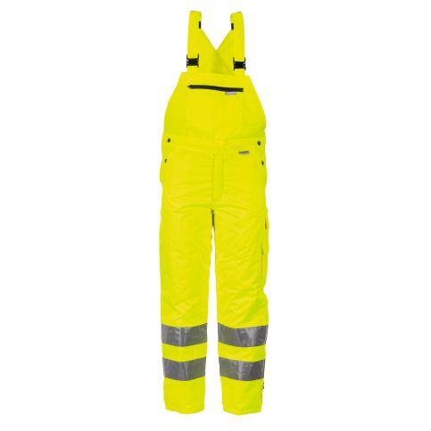 Spodnie występują w intensywnym żółtym kolorze, co zwiększa ich widoczność i bezpieczeństwo w pracy. Zostały zakwalifikowane jako spodnie ostrzegawcze, zimowe termoizolacyjne oraz ogrodniczki, co sprawia, że są odpowiednie do różnorodnych zastosowań przemysłowych oraz rekreacyjnych.