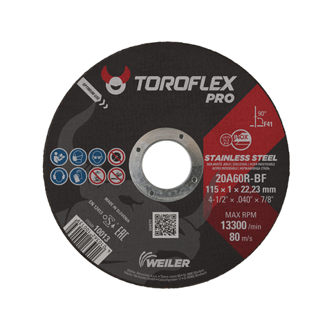 Dzięki podwójnemu wzmocnieniu, tarcza Weiler® Toroflex® PRO Inox & Metal jest niezwykle odporna na uszkodzenia, co sprawia, że jest doskonałym wyborem do agresywnego cięcia. Wysoka prędkość obrotowa na poziomie 13 300 RPM gwarantuje dynamiczne i skuteczne działanie, a także minimalizuje czas poświęcony na wszelkie zadania związane z cięciem.